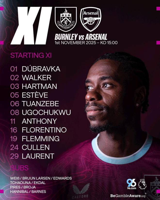 伯恩利vs阿森纳:哲凯赖什首发,埃泽、萨卡、特罗萨德出战